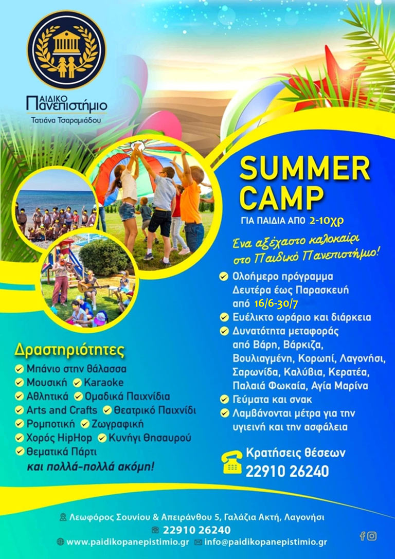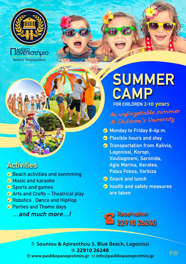⛱Που; Το Summer Camp λειτουργεί στις εγκαταστάσεις του Παιδικού Πανεπιστημίου , στην παραλιακή λεωφόρο Σουνίου, στην Γαλάζια Ακτή, δίπλα στην θάλασσα. Οι εγκαταστάσεις περιλαμβάνουν εσωτερικούς και εξωτερικούς χώρους, κήπους και παιδικές χαρές. Οι αίθουσες κλιματίζονται.